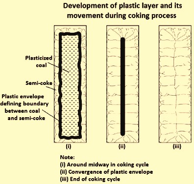 When coal is charged into a hot coke oven, that portion of the coal, which is directly in contact with the walls, is heated very rapidly. When its fusing is reached, the thin layer of heated coal softens and fuses. Destructive distillation reactions proceed rapidly in the plastic layer, with abundant evolution of volatile products. The gas and condensable vapours are entrapped in the plastic mass and, as they expand, tend to swell it. As the reactions proceed and as the temperature of the fused zone increases, the plasticity of the charge begins to decrease. With continued heating and evolution of gas the fused layer gradually re-solidifies to the typical, cellular, coke structure. The characteristics temperatures and stages during coal carbonization is shown in Fig 1, and the development of the plastic layer and its movement during coal carbonization process is shown in Fig 2.