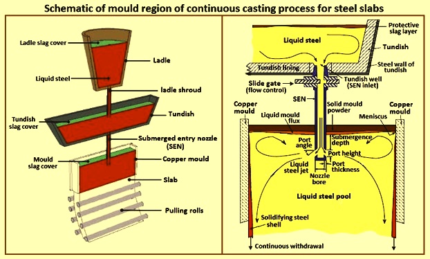 In the continuous casting process, liquid steel flows from a ladle, through a tundish into the mould. The mould is regarded as the heart of the continuous casting process and plays a very important role in the efficiency of the process and the strand quality. It is in the mould that the final cast shape and the strand surface quality are produced. If the conditions are not correct in the mould, then the strand quality cannot be corrected later. Once in the mould, the liquid steel freezes against the walls of the water-cooled copper mould to form a solid shell. Mould is basically an open-ended box structure containing a water-cooled inner lining fabricated from a high purity copper alloy. The box can come in many shapes and sizes in order to cast different semis such as blooms, billets, round beam blanks, slabs, and thin slabs.