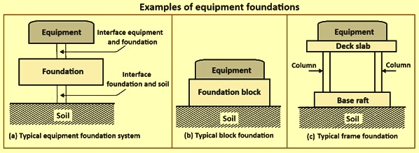 Design approach for equipment foundation – The task for designing of foundations for equipments with dynamic loads in addition to the normal data on the equipment is to contain (i) the technical characteristics of the equipments (name, type, number of rotations per minute, power, and total weight, etc.), (ii) information about the magnitudes, places of application, and directions of action of static loads, as well as about amplitudes and frequencies, places of application, and direction of dynamic loads, (iii) data on the maximum permissible deformations of the foundations and their basement, (iv) requirements for placement of equipment on the foundations, (v) drawings of the dimensions of the foundation within the location of the equipment, fasteners, as well as auxiliary equipment, communications, and hole sizes, (vi) drawings of all communications adjacent to the foundation, (vii) data on the geological conditions of the construction site and soil properties, (viii) information about the location of the designed foundation relative to the nearest structures, and (ix) requirements for the protection of the foundation from ground-water, as well as other external factors characteristic of the design environment.