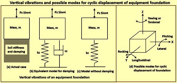 The cyclic displacements of a foundation can have six possible modes namely (i) displacement in the vertical direction, (ii) displacement in the longitudinal direction, (iii) displacement in the lateral direction, (iv) rotation about the vertical axis (yawing or torsional), (v) rotation about the longitudinal axis (rocking), and (v) rotation about the lateral axis (pitching).