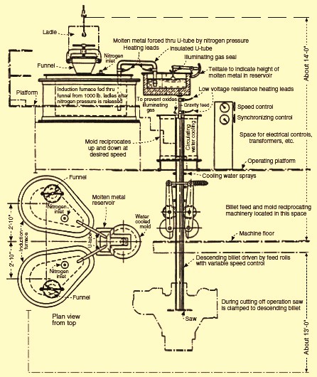 The first CC machine for non-ferrous metal was installed by Rossi, an entrepreneur, in 1937 at Scovill Manufacturing Co. at Waterbury applied several CC processes of that time. The continuous caster (Fig 3), with oscillating mould plus direct cooling with water sprays below looked rather simple but an elaborate system for the supply and feeding of the liquid metal was implemented. These included (i) fully shrouded liquid metal transfer from the ladle through a funnel into two induction heated and inertized holding vessels, arranged in parallel, (ii) from there, shrouded liquid metal transfer into a small and inertized intermediate feeding trough by inert gas pressure (assuring complete slag retention) via resistance heated ducts, and equipped with a metal height indicator, and (iii) then, gravity feed of liquid metal through another resistance heated duct into the gas shrouded mould. Rossi had guaranteed an uninterrupted caster operation of seven days which was achieved from very start of the continuous caster.