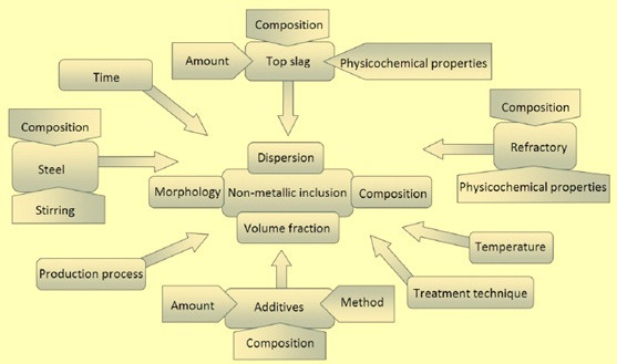 Important features of the secondary steelmaking process are production process, liquid steel, ladle refractories, additives, slag, temperature, and the time and method of treatment. These are crucial factors which have effects on various characteristics of inclusions as shown in Fig 1.