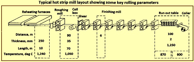 Typically, at the first stand, the roughing mill, the thickness of the hot slab (1,240 deg C) is reduced by making several passes, forward and reverse, through the mill. At the end of this roughing process, the piece is 35 mm thick and 70 m long and its temperature has dropped to 1,050 deg C. Further reduction in thickness takes place in the six or seven closely coupled finishing roll stands. The strip elongation is so great that the piece can straddle a region from the finishing mill approach tables to the coiler. During this part of the process, piece temperature is important and is to be, typically, 870 deg C after the last rolling stand and 600 deg C at the coiler. The width of piece ranges from 500 mm to 2,000 mm, but width changes in the process are limited to a few percent. Majority of the range is achieved by varying the width of the slabs entering the process.