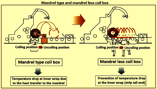 Coil box – It is installed between the roughing mill and the finishing mill to form coils of transfer bars, hence serving as both material and heat accumulator. During uncoiling, tail end of the transfer bar becomes head end of the transfer bar as it enters the finishing mill. Coil box enables a shorter distance between the roughing mill and finishing mill. It also minimizes the temperature drop of the transfer bar entering the finishing mill. Coil box can be with mandrel or it can be mandrel less. The mandrel less coil box contributes further to reducing the temperature drop at the coil inner wraps in comparison to mandrel type coil box. Mandrel less coil box also makes space to install the side heat shields which contribute to reducing the temperature drop at the strip edge. Fig 4 shows mandrel type and mandrel less coil box.