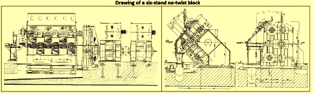 The use of two no-twist blocks (normally a six-stands block and a four-stands block) allows all the dimensions of the wire rods to be rolled thermo-mechanically and inexpensively with high production rates. By splitting the no-twist block, it becomes possible to finish roll in four passes maximum.
