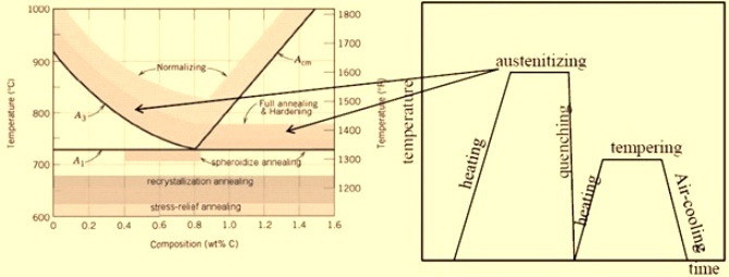 Steels can be hardened by the simple expedient of heating to above the Ac3 transformation temperature, holding long enough for ensuring the achievement of uniform temperature and solution of carbon in the austenite, and then cooling fast (quenching) as shown in Fig 1.