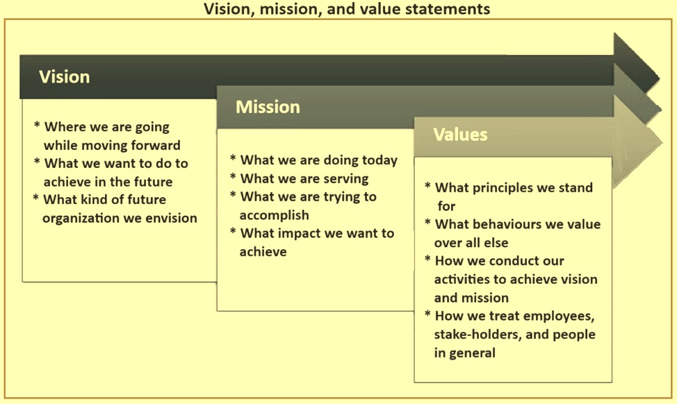 Vision, mission, and values are normally made when the organization is primarily set up and incorporates them into its strategic plan. In leadership theory, a vision statement is used synonymously and inter-changeably with the mission statement, although the two statements are different from one another. All of the recognized organizations make vision and mission statements, which act as the basis for the organizational goal and these are critical and standard elements of the strategy of the organization. Without clear vision and mission, no organization can get any reputation towards the share-holders, stake-holders, and the customers but also can be harmful for the survival of the organization.
