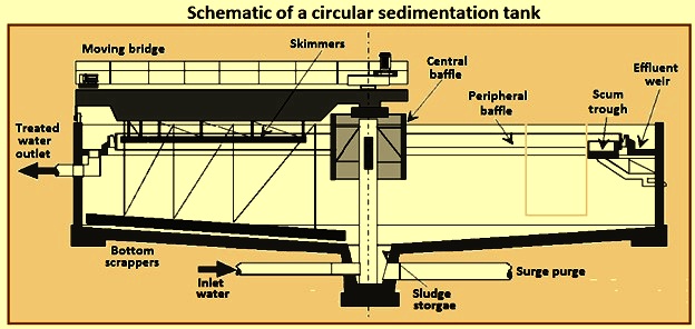 The efficiency of solids removal depends on the characteristics of the sedimentation tank or clarifier. A sedimentation tank is a device which includes inlet baffling for the dissipation of energy, a quiescent zone for particulate settling, and mechanical means for the removal of settled solids, and low flow velocity to the outlet.