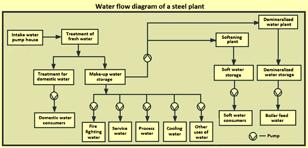 Water has many uses in the iron and steel plant and the quality of water needed for each use also vary. Further there can be one through systems and there can be systems with either partial or full recirculation of water.