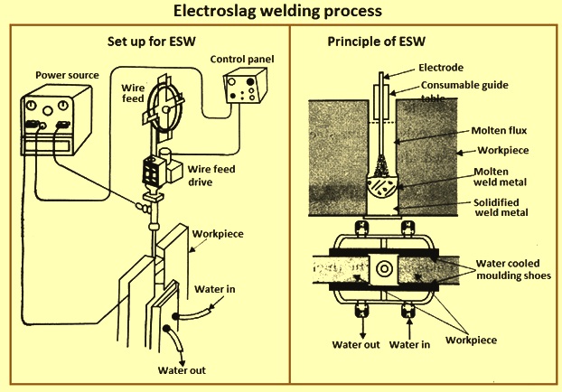 Electroslag welding is a vertical welding process producing coalescence with molten slag which melts the filler metal and the surface of the work to be welded. Confined by cooling shoes, the molten weld pool is shielded by the molten slag, which moves along the full cross section of the joint as welding progresses. The conductive slag is maintained in a molten condition by its resistance to electric current passing between the electrode and the work.